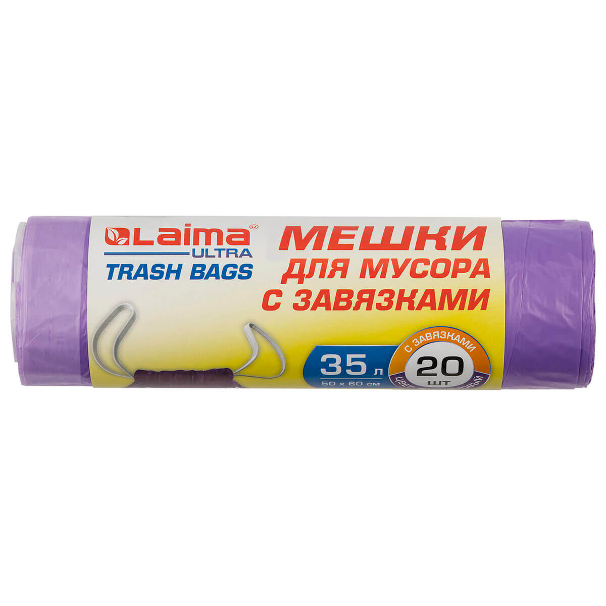 Мешки для мусора 35 л, с завязками, фиолетовые, в рулоне 20 шт., ПНД, 13 мкм, 600х500 мм, LAIMA ULTRA, 607685