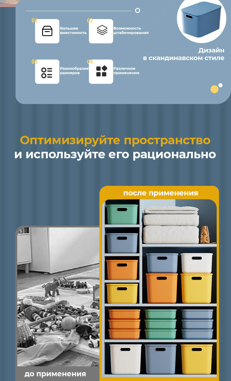 Пластиковый контейнер можно вкладывать один в другой без крышки для компактного хранения. Он отлично подходит для хранения одежды, игрушек, документов, бытовых принадлежностей и других вещей, обеспечивая порядок в доме, офисе или на складе.